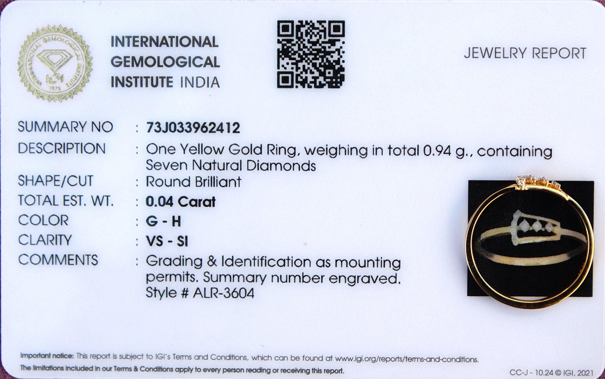18K Solid Gold Ring, 0.94 Carat Natural Diamond Ring, Dainty Proposal Diamond Gold Ring, GH - VS SI Diamond Ring For Her, Certified Jewelry IGI Certified Real Diamond Gold Jewelry. Product Details- Ring Details : Gold Purity : 18K Gold Gross Weight : 0.94 grams Net Weight : 0.932 grams Ring Size : 5 US Diamond Weight : 0.04 carat Diamond Color : G - H Diamond Clarity : VS - SI IGI Report : 73J033962412 IGI Certificate Report Link : https://www.igi.org/verify-your-report/?r=73J033962412 About Diamond :- The history of diamonds is a tale that spans millennia and continents. Diamonds were first discovered in India, where they were revered for their extraordinary beauty and symbolism. Ancient Indian texts, dating back to at least the 4th century BC, mention diamonds as "Vajra," a term signifying both thunderbolts and diamonds, highlighting their indestructibility. Natural Diamond, is one of such sparkling gemstones with various benefits. Real Heera symbolizes true undying love. Physically it is considered unbreakable. On the chemical ground, Diamond is said to be the strongest mineral present on the planet Earth. It is a naturally occurring material produced by components of carbon. Clear colorless diamonds are though quite rare and uncommon; diamonds with a tint of yellow and brown colors are most easily found. Real Diamond, popularly renowned as Heera in Hindi, is one of the nine gemstones on the list of Navratna gemstones. It is undeniably the first love of any woman. Customization:- We are able to make changes to this design according to your need or can make any other design you may desire, just send us photo of your favorite product and get it made in your desired materials. Care Instructions:- Wipe your jewelry with a soft cloth after every use Always store your jewelry in a flat box to avoid accidental scratches For more amazing designs visit our shop https://www.etsy.com/shop/Gemethysts