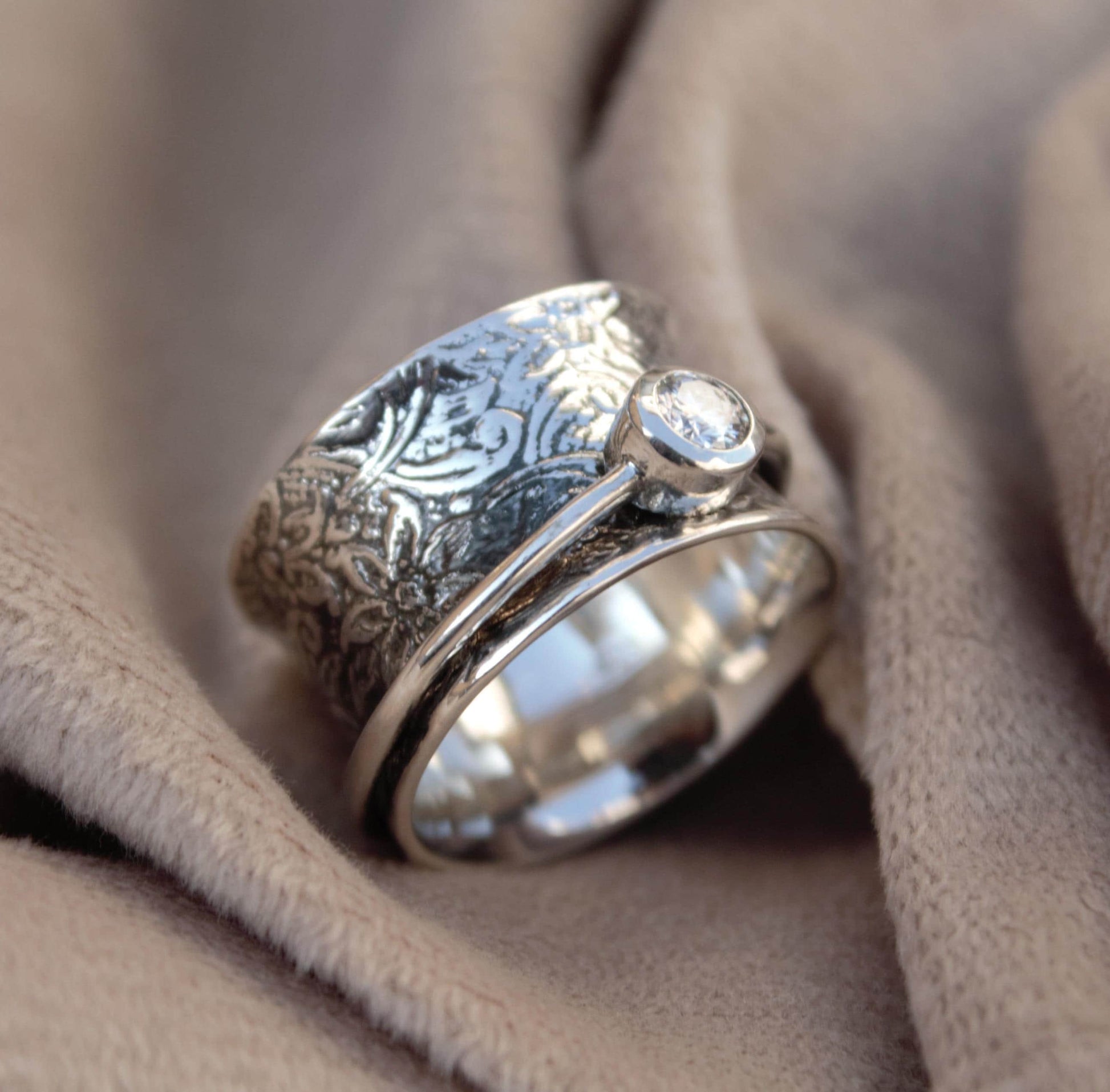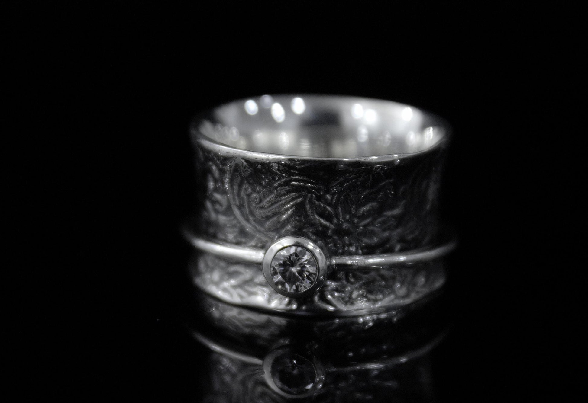 925 Sterling Silver Moissanite Spinner Ring, Meditation Ring for Men and Women, Fidget Spinner Ring Silver, Designer Thumb Ring, Anxiety Ring Product Details : ✥ Material ::- 925 Sterling Silver ✥ Gemstone ::- Moissanite ✥ Gross Weight ::- 9.1025 Gm. (Approx) ✥ Net Weight ::- 9.0575 Gm. (Approx) ✥ Stone Weight ::- 0.2257 Ct. (Approx) ✥ Stone Quantity ::- 1 ✥ Gemstone Shape ::- Round Customization:- We are able to make changes to this design according to your need or can make any other design you may desire, just send us photo of your favourite product and get it made in your desired materials. Care Instructions:- Wipe your jewelry with a soft cloth after every use Always store your jewelry in a flat box to avoid accidental scratches Benefits Of Wearing Moissanite Gemstone : Moissanite a diamond alternative encourages you to set greater goals and accomplish success and recognition in your industry of choice. Your personality becomes more endearing, likeable, and magnificent. Also Moissanite is diamond tester positive. Moissanite is believed to be a stone of the future and can help those who want to manifest their dreams and desires. It is said to enhance intuition and creativity and can help you tap into your inner power and potential. If you have any questions or need more information, Please feel free to contact us. For more amazing designs visit our shop https://www.etsy.com/shop/Gemethysts