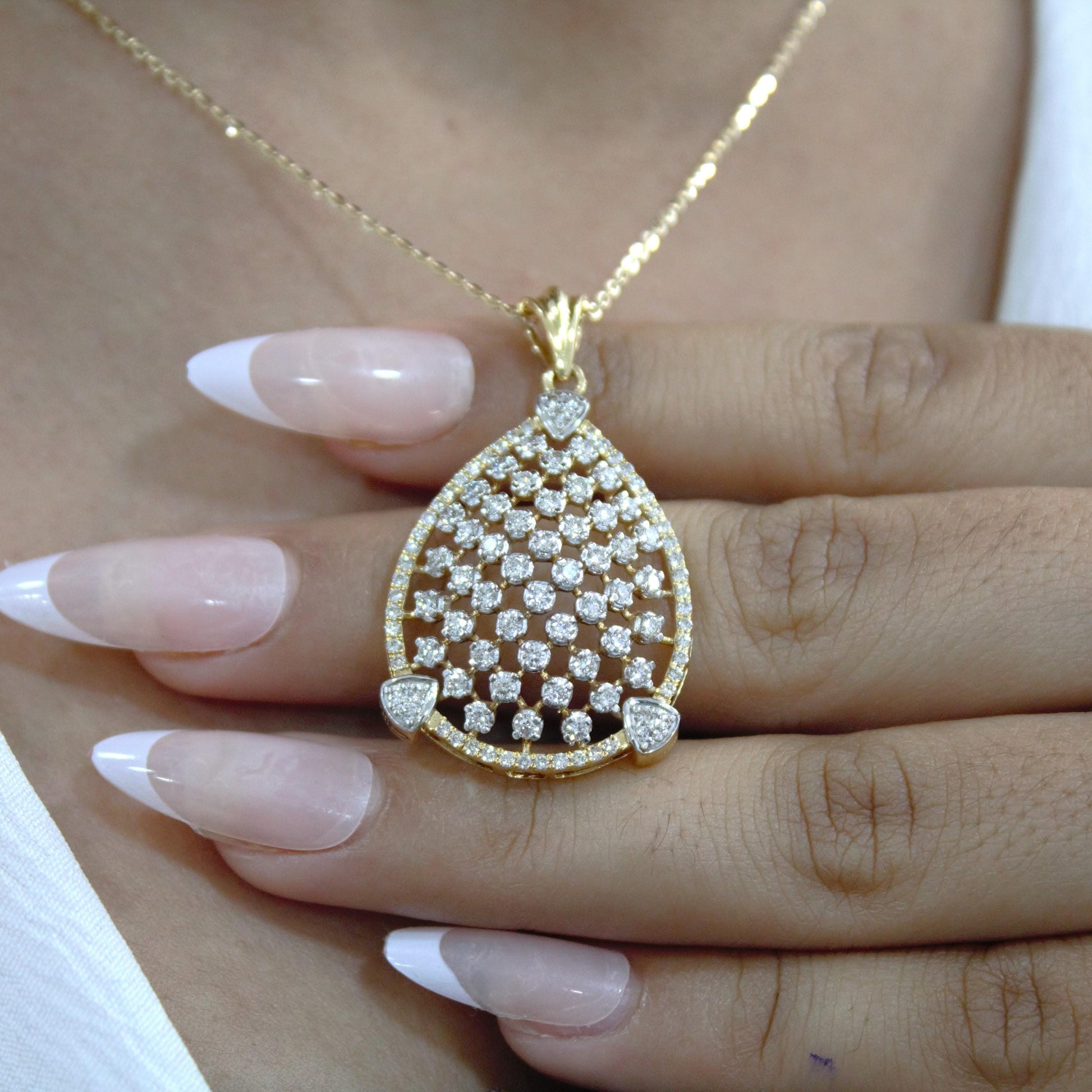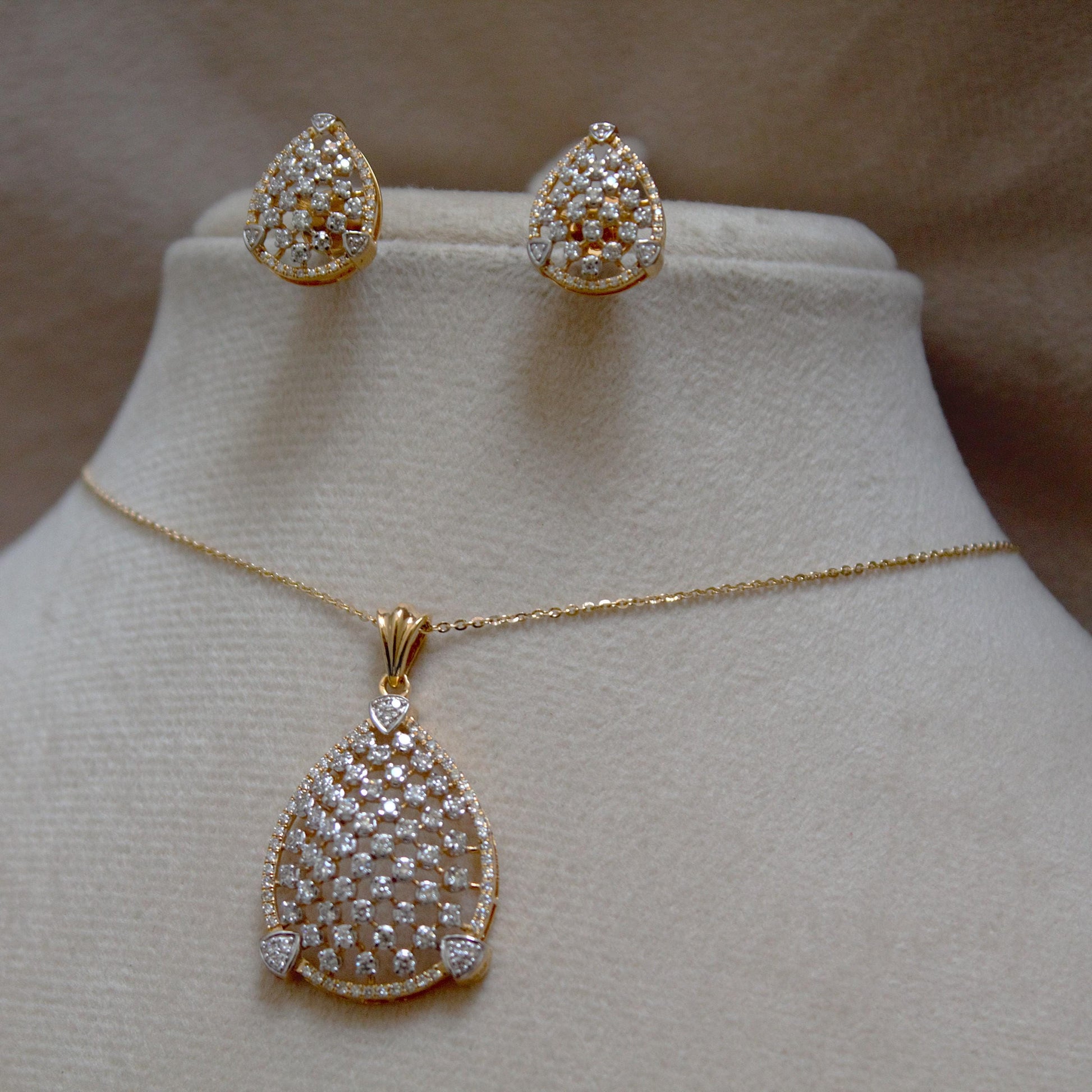 Classic Statement Solid Gold Jewelry Set, Pear Shape Pendant with Earrings, Natural Diamond Necklace Earrings Set, 18K Gold Jewelry for Mom IGI Certified Real Diamond Gold Jewelry. Product Details- Necklace Details : Gold Purity : 18K Gold Gross Weight : 8.040 grams Net Weight : 7.752 grams Diamond Weight : 1.44 carat Diamond Color : G - H Diamond Clarity : VS - SI IGI Report : 73J151072412 IGI Certificate Report Link : https://www.igi.org/verify-your-report/?r=73J151072412 Earrings Details : Gold Purity : 18K Gold Gross Weight : 6.060 grams Net Weight : 5.940 grams Diamond Weight : 0.60 carat Diamond Color : G - H Diamond Clarity : VS - SI IGI Report : 73J151082412 IGI Certificate Report Link : https://www.igi.org/verify-your-report/?r=73J151082412 About Diamond :- The history of diamonds is a tale that spans millennia and continents. Diamonds were first discovered in India, where they were revered for their extraordinary beauty and symbolism. Ancient Indian texts, dating back to at least the 4th century BC, mention diamonds as "Vajra," a term signifying both thunderbolts and diamonds, highlighting their indestructibility. Natural Diamond, is one of such sparkling gemstones with various benefits. Real Heera symbolizes true undying love. Physically it is considered unbreakable. On the chemical ground, Diamond is said to be the strongest mineral present on the planet Earth. It is a naturally occurring material produced by components of carbon. Clear colorless diamonds are though quite rare and uncommon; diamonds with a tint of yellow and brown colors are most easily found. Real Diamond, popularly renowned as Heera in Hindi, is one of the nine gemstones on the list of Navratna gemstones. It is undeniably the first love of any woman. Customization:- We are able to make changes to this design according to your need or can make any other design you may desire, just send us photo of your favorite product and get it made in your desired materials. Care Instructions:- Wipe your jewelry with a soft cloth after every use Always store your jewelry in a flat box to avoid accidental scratches For more amazing designs visit our shop https://www.etsy.com/shop/Gemethysts
