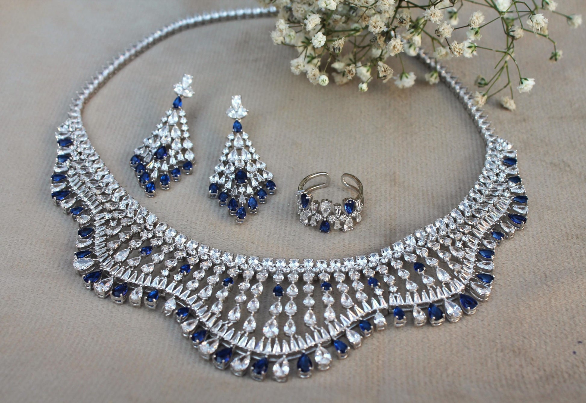 Cubic Zirconia Silver Jewelry Set, Choker Necklace with Earring-Ring-Bracelet, Designer 925Sterling Jewelry Set Perfect Valentines Day Gift ** READY TO SHIP ** Product Details : Metel : 925 Sterling Silver Necklace Weight - 64.8 Gm. Bracelet Weight - 21.1 Gm. Earrings Weight - 11.8 Gm. Ring Weight - 4 Gm. Perfect for: * Engagements, weddings, or anniversary gifts * A special statement piece for formal events * Everyday luxury and elegance Customization:- We are able to make changes to this design according to your need or can make any other design you may desire, just send us photo of your favourite product and get it made in your desired materials. Care Instructions:- Wipe your jewelry with a soft cloth after every use Always store your jewelry in a flat box to avoid accidental scratches If you have any questions or need more information, Please feel free to contact us. For more amazing designs visit our shop https://www.etsy.com/shop/Gemethysts