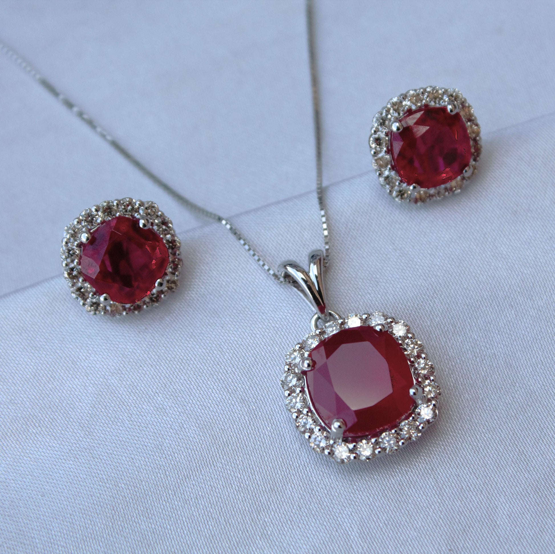 Cushion Ruby with Natural Diamond Jewelry Set, Solitaire Halo Pendant with Stud Earrings, 18k White Gold Jewelry, Engagement Gift for Bride IGI Certified Real Diamond Gold Jewelry. Product Details- Necklace Details : Gold Purity : 18K Gold Gross Weight : 6.81 grams Net Weight : 4.882 grams Diamond Weight : 0.94 carat Stone Weight : 8.70 carat Diamond Color : I - J Diamond Clarity : SI IGI Report : 73J150102412 IGI Certificate Report Link : https://www.igi.org/verify-your-report/?r=73J150102412 Earrings Details : Gold Purity : 18K Gold Gross Weight : 6.28 grams Net Weight : 4.392 grams Diamond Weight : 1.33 carat Stone Weight : 8.11 carat Diamond Color : I - J Diamond Clarity : SI IGI Report : 73J150112412 IGI Certificate Report Link : https://www.igi.org/verify-your-report/?r=73J150112412 About Diamond :- The history of diamonds is a tale that spans millennia and continents. Diamonds were first discovered in India, where they were revered for their extraordinary beauty and symbolism. Ancient Indian texts, dating back to at least the 4th century BC, mention diamonds as "Vajra," a term signifying both thunderbolts and diamonds, highlighting their indestructibility. Natural Diamond, is one of such sparkling gemstones with various benefits. Real Heera symbolizes true undying love. Physically it is considered unbreakable. On the chemical ground, Diamond is said to be the strongest mineral present on the planet Earth. It is a naturally occurring material produced by components of carbon. Clear colorless diamonds are though quite rare and uncommon; diamonds with a tint of yellow and brown colors are most easily found. Real Diamond, popularly renowned as Heera in Hindi, is one of the nine gemstones on the list of Navratna gemstones. It is undeniably the first love of any woman. Customization:- We are able to make changes to this design according to your need or can make any other design you may desire, just send us photo of your favorite product and get it made in your desired materials. Care Instructions:- Wipe your jewelry with a soft cloth after every use Always store your jewelry in a flat box to avoid accidental scratches For more amazing designs visit our shop https://www.etsy.com/shop/Gemethysts