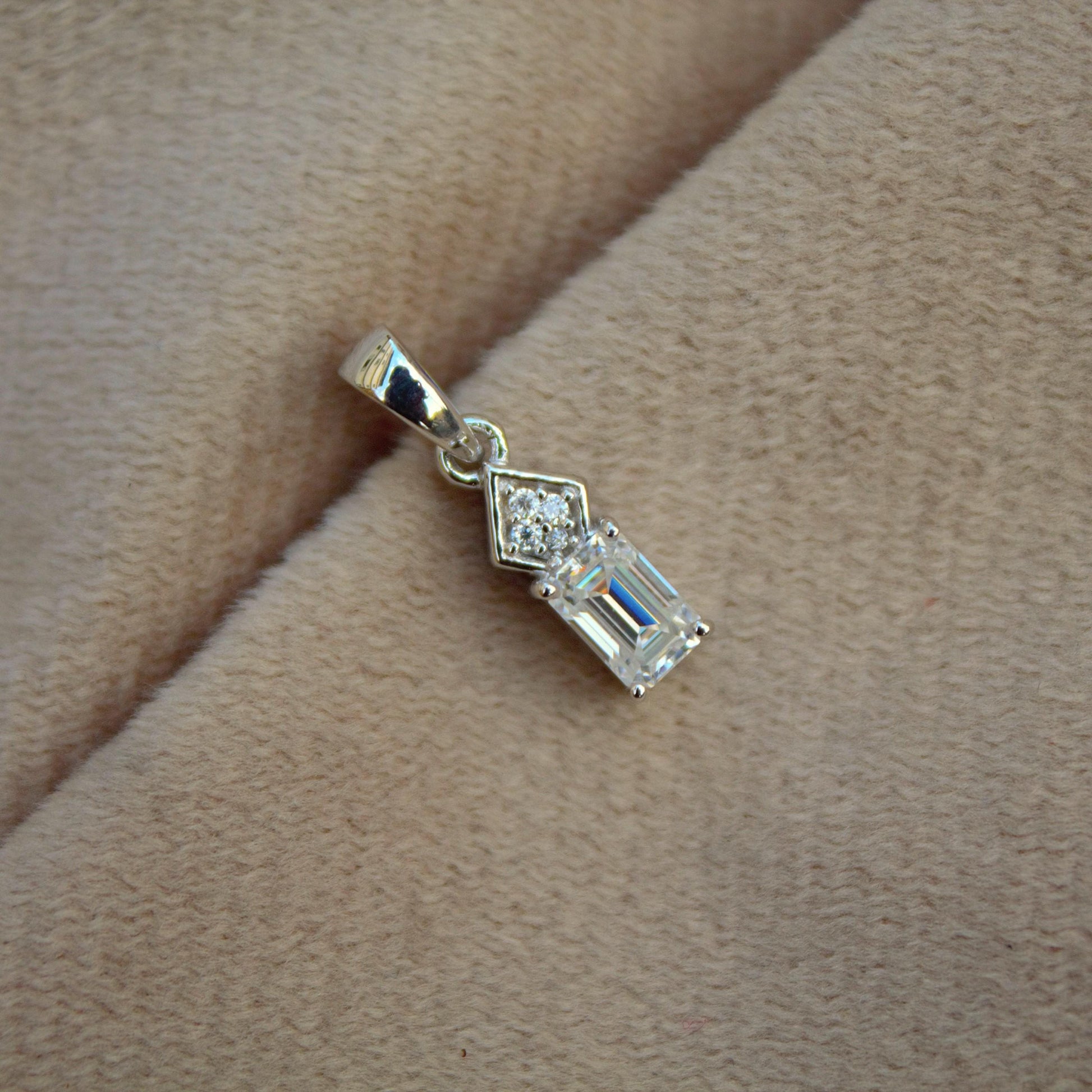 Emerald Cut Silver Charm Pendant, Colorless Moissanite Dainty Pendant, 925 Sterling Silver Jewelry, Tiny Pendant, White Moissanite Jewelry Product Details : ✥ Material ::- 925 Sterling Silver ✥ Gemstone ::- Moissanite ✥ Gross Weight ::- 1.165 Gm. (Approx) ✥ Net Weight ::- 1.033 Gm. (Approx) ✥ Stone Weight ::- 0.656 Ct. (Approx) ✥ Stone Quantity ::- 5 ✥ Gemstone Shape ::- Emerald Cut, Round Customization:- We are able to make changes to this design according to your need or can make any other design you may desire, just send us photo of your favorite product and get it made in your desired materials. Care Instructions:- Wipe your jewelry with a soft cloth after every use Always store your jewelry in a flat box to avoid accidental scratches Benefits Of Wearing Moissanite Gemstone :- Moissanite a diamond alternative encourages you to set greater goals and accomplish success and recognition in your industry of choice. Your personality becomes more endearing, likeable, and magnificent. Also Moissanite is diamond tester positive. Moissanite is believed to be a stone of the future and can help those who want to manifest their dreams and desires. It is said to enhance intuition and creativity and can help you tap into your inner power and potential. If you have any questions or need more information, Please feel free to contact us. For more amazing designs visit our shop https://www.etsy.com/shop/Gemethysts