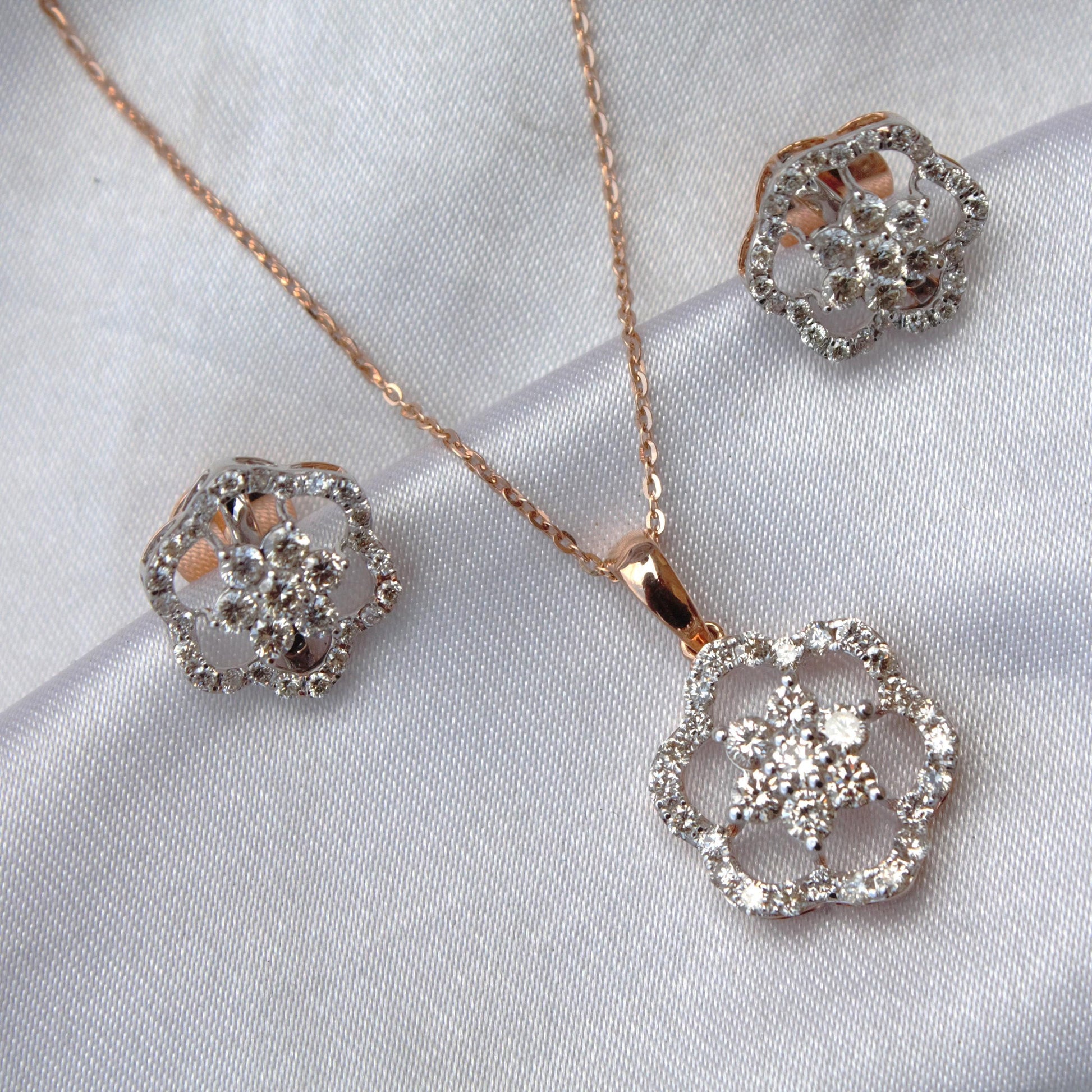 Floral Shape Gold Diamond Jewelry Set, 18k Rose Gold Chain Pendant with Stud Earrings, Real Diamond Bridal Jewelry Set for Wedding Gift