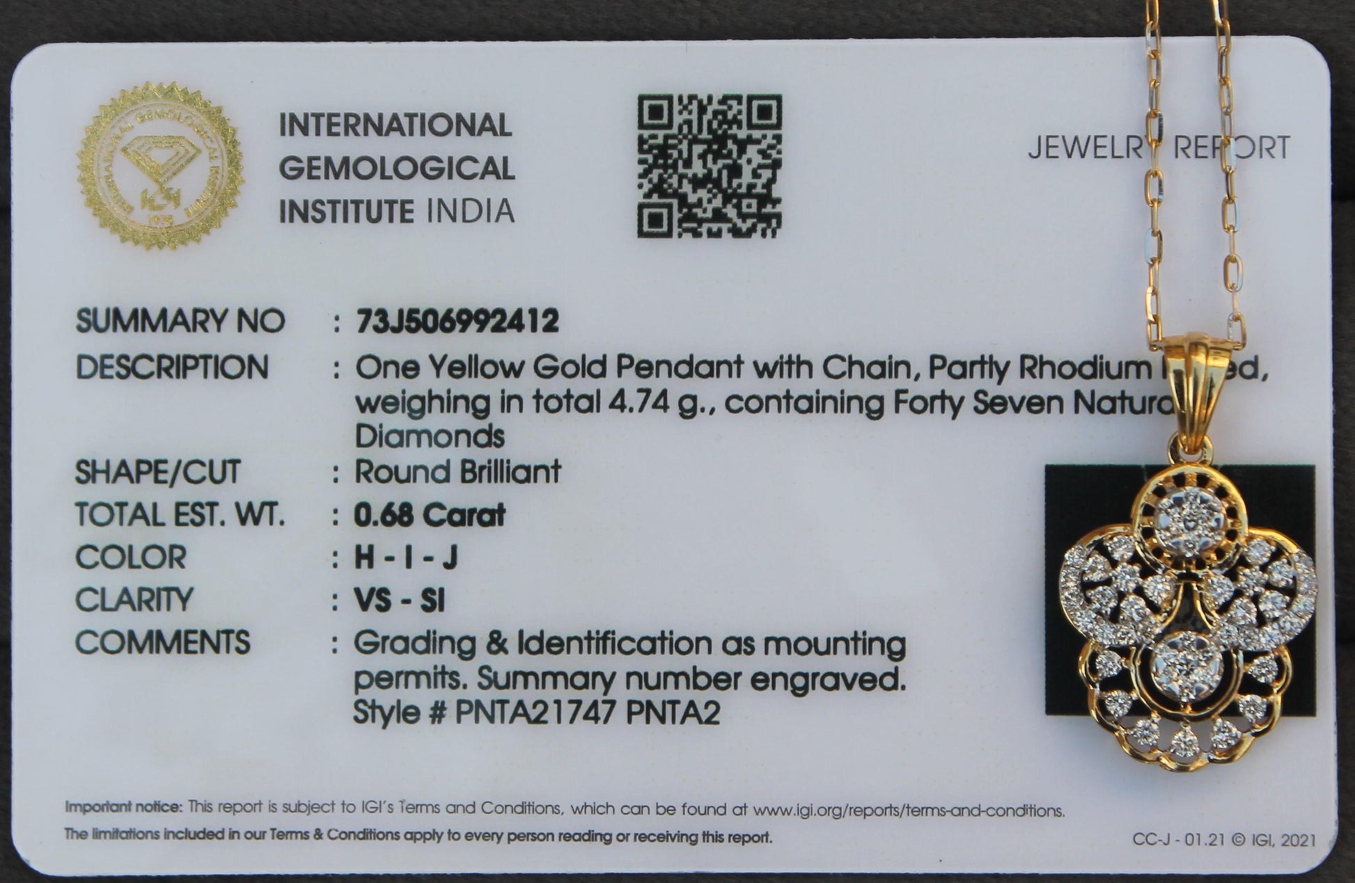 IGI Certified Gold Diamond Jewelry, Natural Diamond Earring With Necklace Set, 18K Gold Diamond Jewelry, Designer Diamond Set Gift For Her IGI Certified Real Diamond Gold Jewelry. Product Details- Necklace Details : Gold Purity : 18K Gold Gross Weight : 4.74 grams Net Weight : 4.604 grams Diamond Weight : 0.68 carat Diamond Color : H-I-J Diamond Clarity : VS - SI IGI Report : 73J506992412 IGI Certificate Report Link : https://www.igi.org/verify-your-report/?r=73J506992412 Earrings Details : Gold Purity : 18K Gold Gross Weight : 3.78 grams Net Weight : 3.67 grams Diamond Weight : 0.55 carat Diamond Color : H - I Diamond Clarity : SI IGI Report : 73J150852412 IGI Certificate Report Link : https://www.igi.org/verify-your-report/?r=73J150852412 About Diamond :- The history of diamonds is a tale that spans millennia and continents. Diamonds were first discovered in India, where they were revered for their extraordinary beauty and symbolism. Ancient Indian texts, dating back to at least the 4th century BC, mention diamonds as "Vajra," a term signifying both thunderbolts and diamonds, highlighting their indestructibility. Natural Diamond, is one of such sparkling gemstones with various benefits. Real Heera symbolizes true undying love. Physically it is considered unbreakable. On the chemical ground, Diamond is said to be the strongest mineral present on the planet Earth. It is a naturally occurring material produced by components of carbon. Clear colorless diamonds are though quite rare and uncommon; diamonds with a tint of yellow and brown colors are most easily found. Real Diamond, popularly renowned as Heera in Hindi, is one of the nine gemstones on the list of Navratna gemstones. It is undeniably the first love of any woman. Customization:- We are able to make changes to this design according to your need or can make any other design you may desire, just send us photo of your favorite product and get it made in your desired materials. Care Instructions:- Wipe your jewelry with a soft cloth after every use Always store your jewelry in a flat box to avoid accidental scratches For more amazing designs visit our shop https://www.etsy.com/shop/Gemethysts