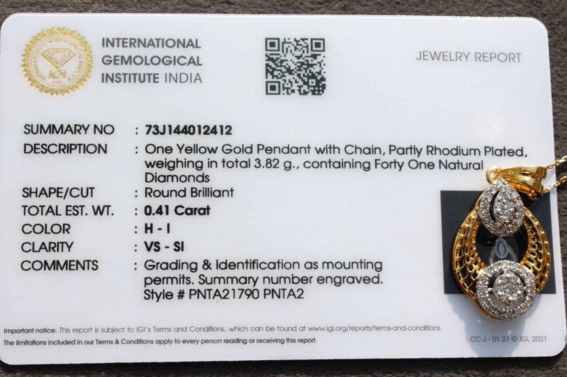 IGI Certified Natural Diamond Necklace with Stud Earrings, Solid 18K Gold Pendant with Chain and Earrings, Designer Gold Diamond Jewelry IGI Certified Real Diamond Gold Jewelry. Product Details- Necklace Details : Gold Purity : 18K Gold Gross Weight : 3.820 grams Net Weight : 3.738 grams Diamond Weight : 0.41 carat Diamond Color : H-I Diamond Clarity : VS-SI IGI Report : 73J144012412 IGI Certificate Report Link : https://www.igi.org/verify-your-report/?r=73J144012412 Earrings Details : Gold Purity : 18K Gold Gross Weight : 2.12 grams Net Weight : 2.066 grams Diamond Weight : 0.27 carat Diamond Color : H-I Diamond Clarity : SI IGI Report : 73J150932412 IGI Certificate Report Link : https://www.igi.org/verify-your-report/?r=73J150932412 About Diamond :- The history of diamonds is a tale that spans millennia and continents. Diamonds were first discovered in India, where they were revered for their extraordinary beauty and symbolism. Ancient Indian texts, dating back to at least the 4th century BC, mention diamonds as "Vajra," a term signifying both thunderbolts and diamonds, highlighting their indestructibility. Natural Diamond, is one of such sparkling gemstones with various benefits. Real Heera symbolizes true undying love. Physically it is considered unbreakable. On the chemical ground, Diamond is said to be the strongest mineral present on the planet Earth. It is a naturally occurring material produced by components of carbon. Clear colorless diamonds are though quite rare and uncommon; diamonds with a tint of yellow and brown colors are most easily found. Real Diamond, popularly renowned as Heera in Hindi, is one of the nine gemstones on the list of Navratna gemstones. It is undeniably the first love of any woman. Customization:- We are able to make changes to this design according to your need or can make any other design you may desire, just send us photo of your favorite product and get it made in your desired materials. Care Instructions:- Wipe your jewelry with a soft cloth after every use Always store your jewelry in a flat box to avoid accidental scratches For more amazing designs visit our shop https://www.etsy.com/shop/Gemethysts