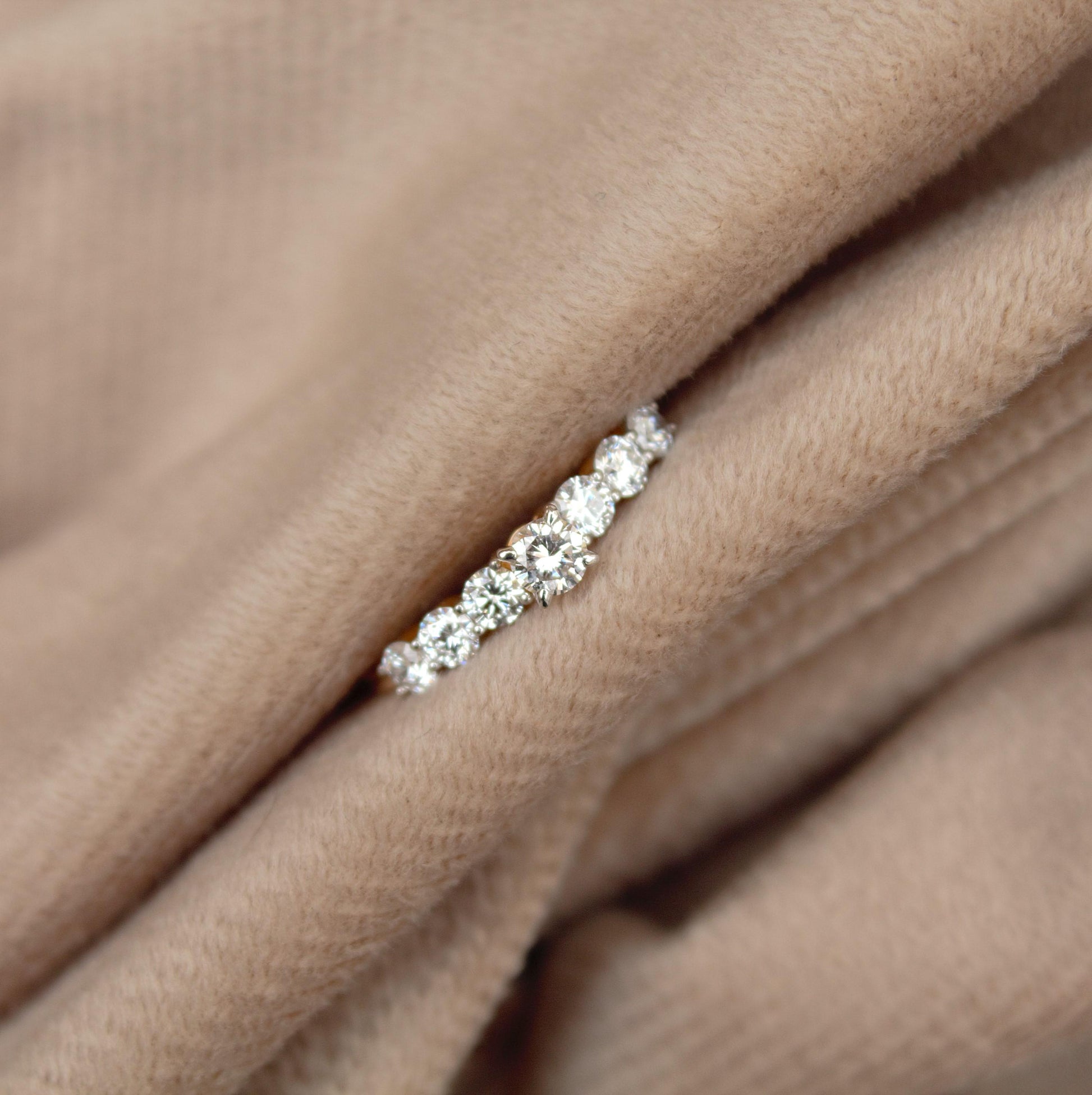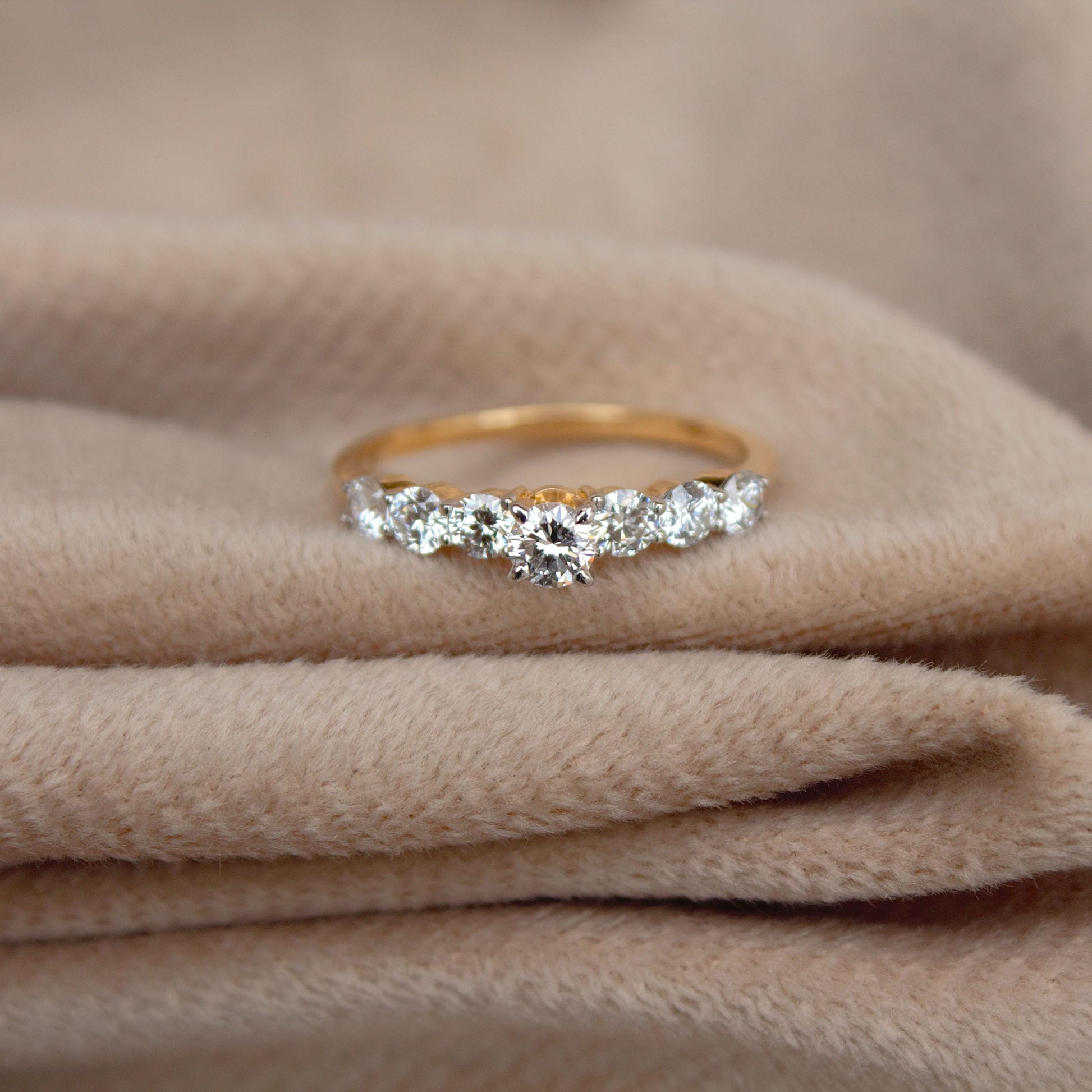 Lab Grown Diamond Minimalist Ring, US 7 Ring, 14K Yellow Gold Anniversary Ring, Stackable Ring for Women, Real Gold Jewelry, Ready to Ship Product Details :- Diamond Details: ↣ Type : Lab Grown Diamond (CVD/HPHT) ↣ Shape : Round ↣ Size : 3.80 mm (1 Pc.), 2.90 mm (6 Pcs) ↣ Weight : 0.74 Ct. ↣ No. of Diamond : 7 ↣ Color/ Clarity : E - VS1 Ring Details : ↣ Material : 14K Solid Yellow Gold ↣ Setting : Prong ↣ Size : US 7 ↣ GW : 1.92 Gm. ↣ NW : 1.772 Gm. Customization:- We are able to make changes to this design according to your need or can make any other design you may desire, just send us photo of your favorite product and get it made in your desired materials. Care Instructions:- Wipe your jewelry with a soft cloth after every use Always store your jewelry in a flat box to avoid accidental scratches About Lab Diamond :- Lab-grown diamonds share the same physical, chemical, and optical properties as mined diamonds. Their matching brilliance and sparkle make their appearance indistinguishable from diamonds sourced from the Earth. These gems are created in controlled, humane conditions. This eliminates concerns about 'blood diamonds' or worker exploitation that can occur in diamond mining. Lab-grown diamonds shine brightly as an excellent choice for your jewelry. These ethical diamonds offer the identical aesthetic of mined diamonds, with the added benefits of sustainability, affordability, and higher quality. If you have any questions or need more information, Please feel free to contact us. For more amazing designs visit our shop https://www.etsy.com/shop/Gemethysts