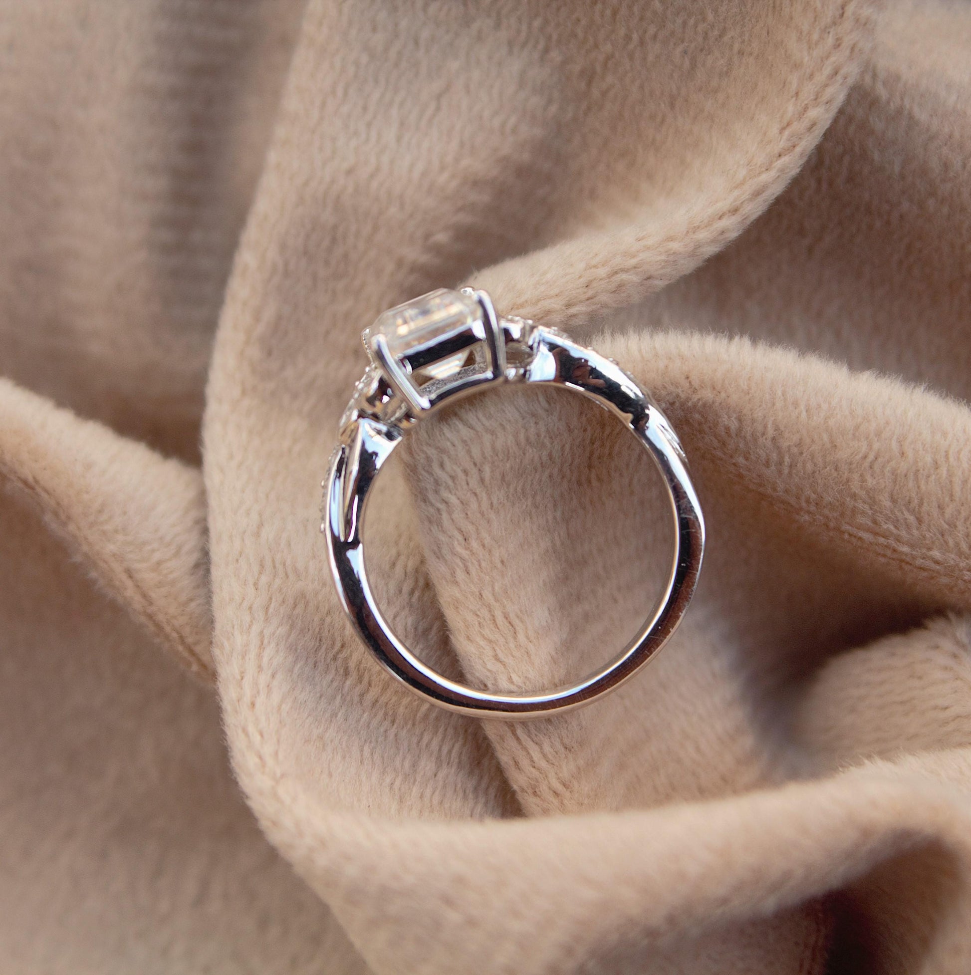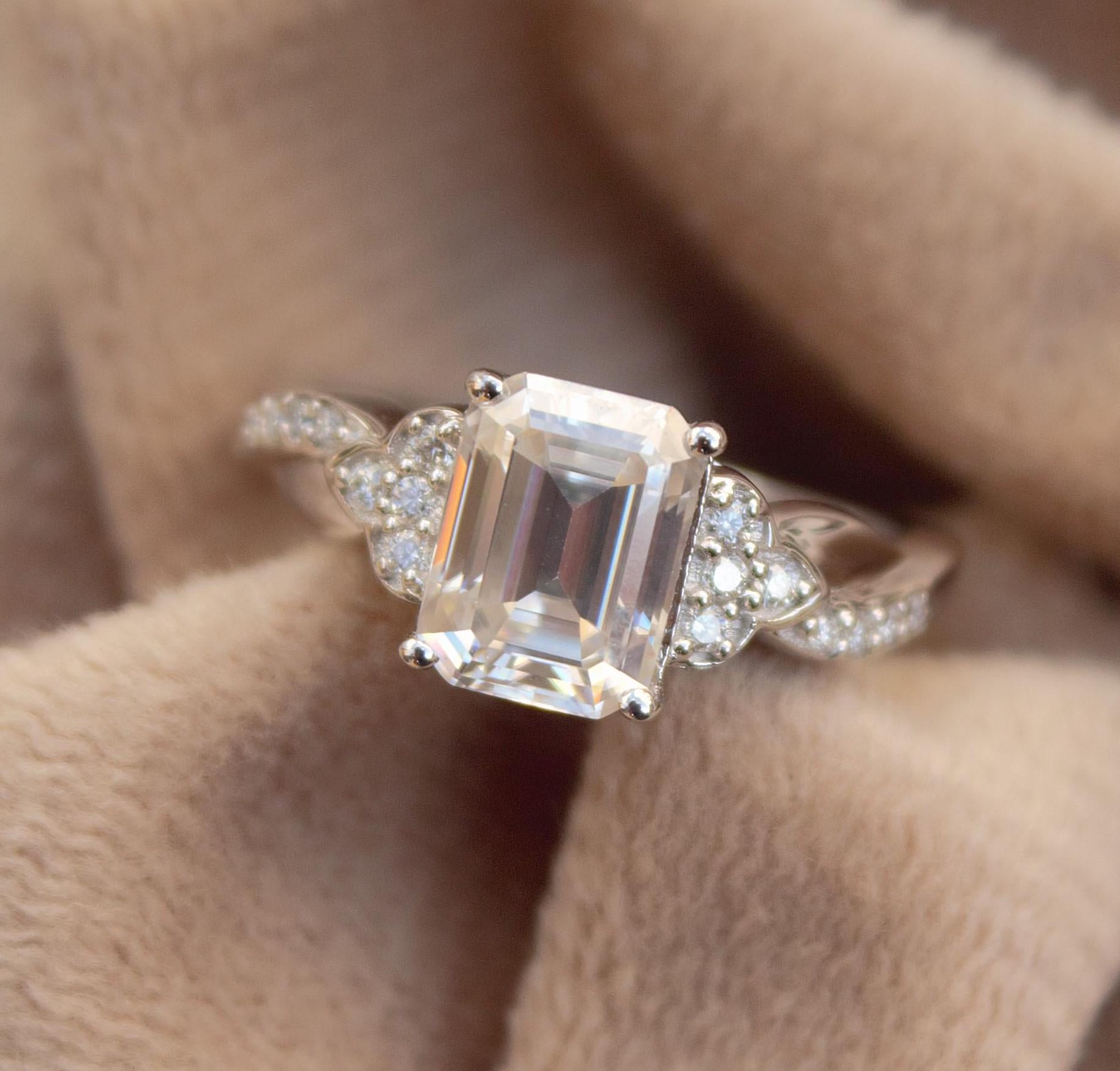 Moissanite Emerald Cut Elegant Ring, Minimalist Silver Ring, 925 Sterling Silver Ring, Anniversary Ring, Solitaire Prong Set Ring for Wife Product Details : ✥ Material ::- 925 Sterling Silver ✥ Gemstone ::- Moissanite ✥ Gross Weight ::- 2.887 Gm. (approx) ✥ Net Weight ::- 2.551 Gm. (approx) ✥ Stone Weight ::- 1.68 Ct. (approx) ✥ Stone Quantity ::- 17 ✥ Ring Size ::- 5.5, 6.5, 7.5 US ✥ Gemstone Shape ::- Emerald Cut, Round Customization:- We are able to make changes to this design according to your need or can make any other design you may desire, just send us photo of your favourite product and get it made in your desired materials. Care Instructions:- Wipe your jewelry with a soft cloth after every use Always store your jewelry in a flat box to avoid accidental scratches Benefits Of Wearing Moissanite Gemstone :- Moissanite a diamond alternative encourages you to set greater goals and accomplish success and recognition in your industry of choice. Your personality becomes more endearing, likeable, and magnificent. Also Moissanite is diamond tester positive. Moissanite is believed to be a stone of the future and can help those who want to manifest their dreams and desires. It is said to enhance intuition and creativity and can help you tap into your inner power and potential. If you have any questions or need more information, Please feel free to contact us. For more amazing designs visit our shop https://www.etsy.com/shop/Gemethysts