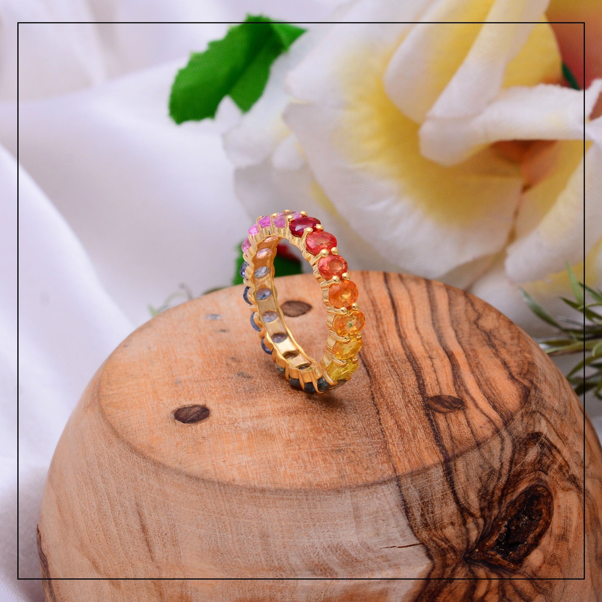 Multi Sapphire Oval Eternity Band, Natural Stone Ring, Wedding Band for Bride, Oval Sapphire Ring, Healing Ring, Real Gold Jewelry for Her Product Details : ✦ Stone: Rainbow Sapphire ✦ Stone Type : Natural ✦ Stone Size : 4X3 MM ✦ Stone Shape : Oval cut ✦ Number of stones : 19 ✦ Stone Grade : AAA METAL DETAILS : ✦ Metal : Solid 14K / 18K Gold / Sterling Silver ✦ Metal Colour : Yellow / White / Rose Gold / Sterling Silver 925 ✦ Ring Box : Yes Customization:- We are able to make changes to this design according to your need or can make any other design you may desire, just send us photo of your favorite product and get it made in your desired materials. Care Instructions:- Wipe your jewelry with a soft cloth after every use Always store your jewelry in a flat box to avoid accidental scratches About Rainbow Sapphire :- Rainbow sapphires make perfect gifts, not only due to their mesmerizing beauty but also because they are associated with meaningful symbolism. As a birthstone for September, these gems are believed to bring wisdom, protection, and good fortune to those born during this month. Wearing Rainbow Sapphires is believed to cure various diseases like rheumatism and colic and mental illnesses like tension and mental confusion. Rainbow sapphires are a good choice for jewelry because they complement all outfits, express your inner wild and vibrant side, and have aesthetic appeal and sophisticated elegance. If you have any questions or need more information, Please feel free to contact us. For more amazing designs visit our shop https://www.etsy.com/shop/Gemethysts