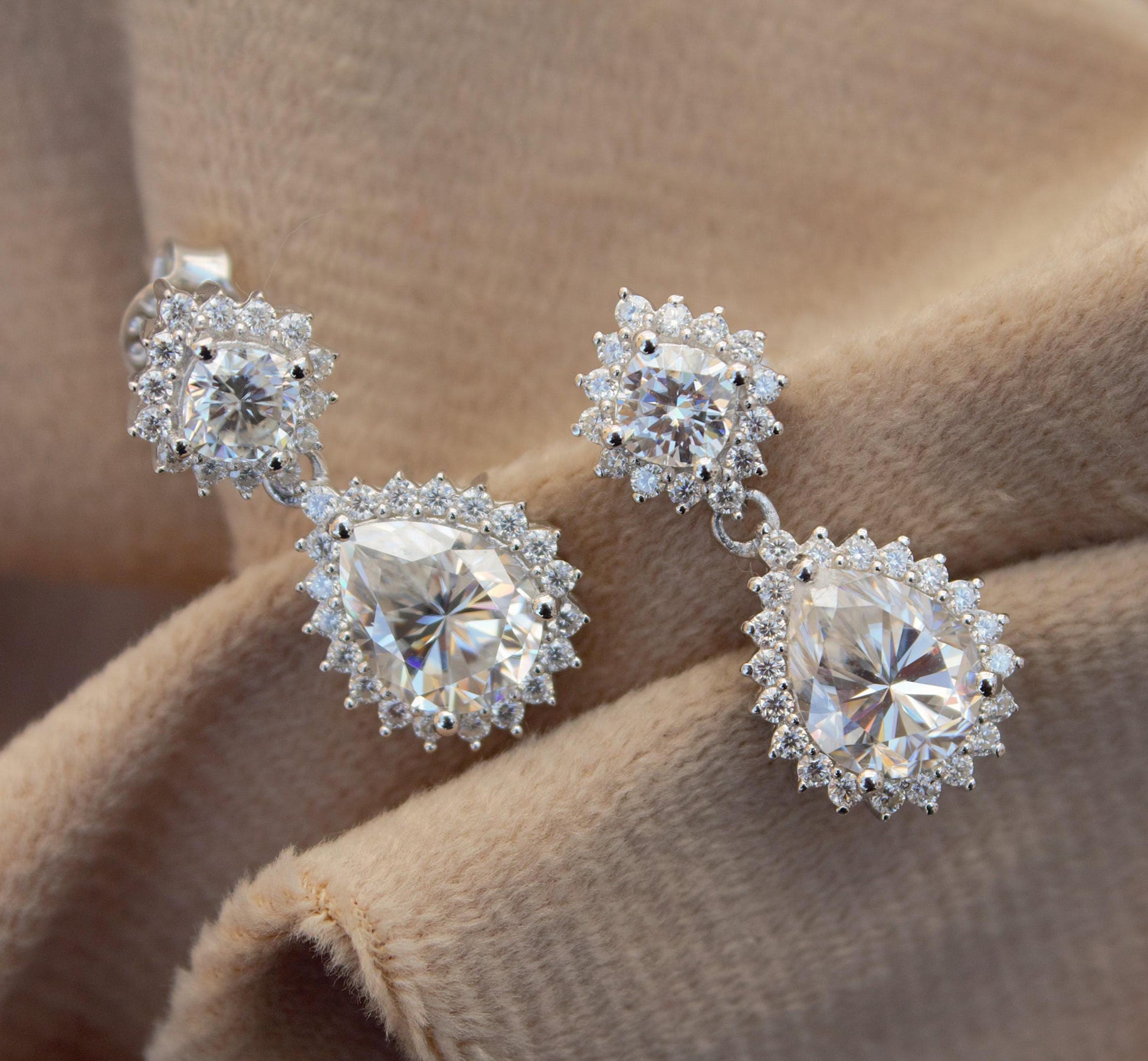 Pear Moissanite Drop Earrings, 925 Sterling Silver Push Back Earrings, Designer Dangle Earrings, Silver Bridal Earrings, Moissanite Jewelry Product Details : ✥ Material ::- 925 Sterling Silver ✥ Gemstone ::- Moissanite ✥ Gross Weight ::- 5.82 Gm. (Approx) ✥ Net Weight ::- 4.472 Gm. (Approx) ✥ Stone Weight ::- 6.74 Ct. (Approx) ✥ Stone Quantity ::- 72 ✥ Gemstone Shape ::- Pear, Cushion, Round Customization:- We are able to make changes to this design according to your need or can make any other design you may desire, just send us photo of your favourite product and get it made in your desired materials. Care Instructions:- Wipe your jewelry with a soft cloth after every use Always store your jewelry in a flat box to avoid accidental scratches Benefits Of Wearing Moissanite Gemstone :- Moissanite a diamond alternative encourages you to set greater goals and accomplish success and recognition in your industry of choice. Your personality becomes more endearing, likeable, and magnificent. Also Moissanite is diamond tester positive. Moissanite is believed to be a stone of the future and can help those who want to manifest their dreams and desires. It is said to enhance intuition and creativity and can help you tap into your inner power and potential. If you have any questions or need more information, Please feel free to contact us. For more amazing designs visit our shop https://www.etsy.com/shop/Gemethysts