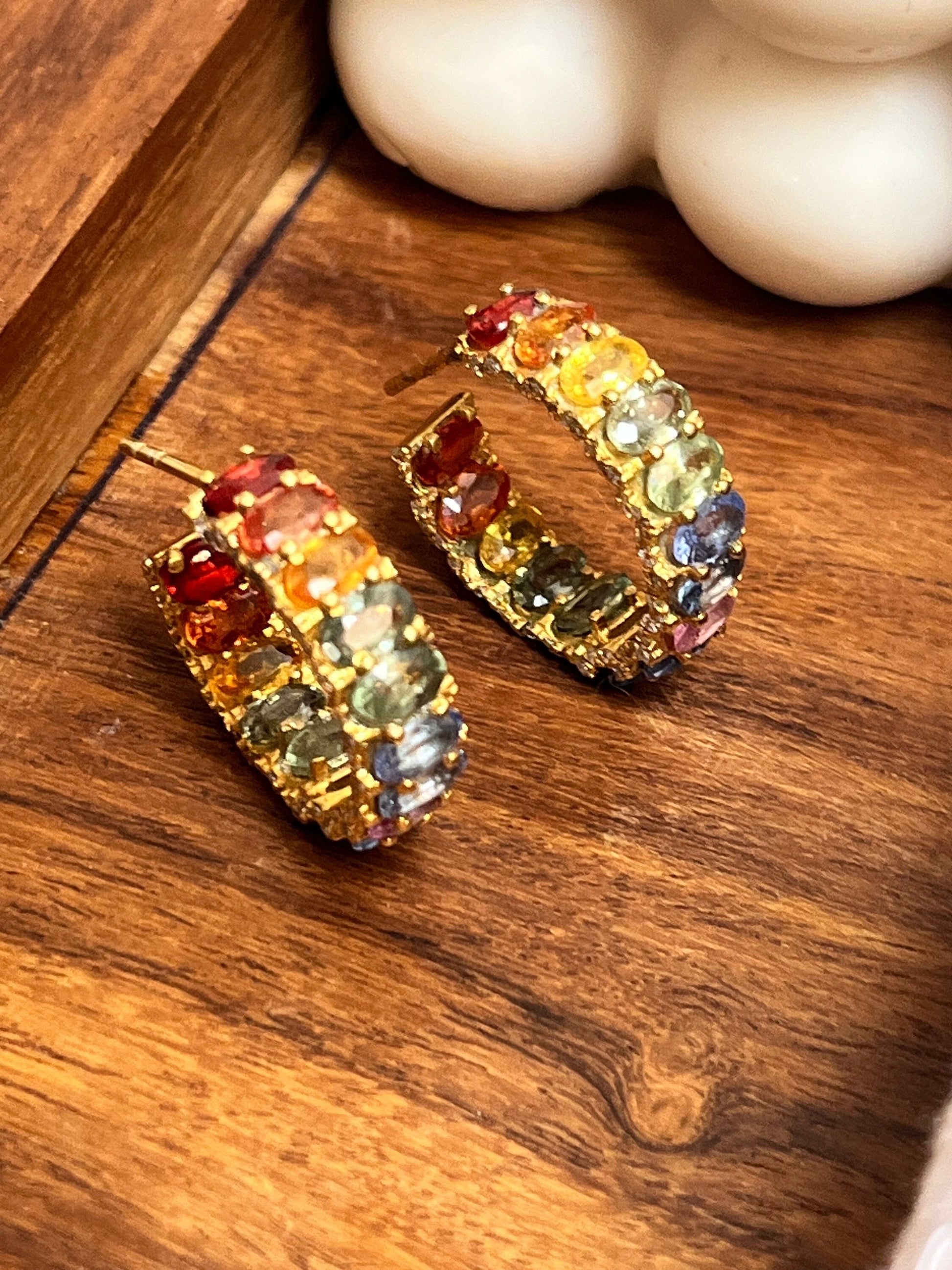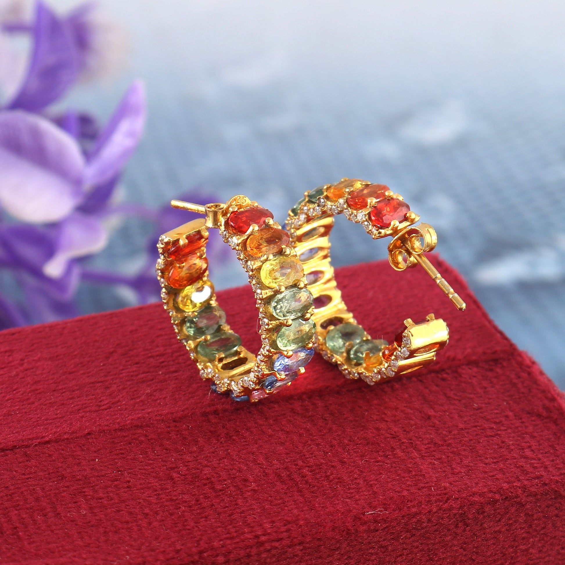 Rainbow Sapphire Hoop Earring, Natural Multi Sapphire & Moissanite Melee Stones Jewelry, Rainbow Ombre Gold Earring, Gradient Huggie Earring Product Details : STONE DETAILS : ✦ Stone: Rainbow Sapphire and Moissanite Melee Stones ✦ Stone Type : Natural ✦ Stone Size : 3 X 4 MM (approx) ✦ Stone Shape : Oval cut ✦ Number Of Stones : 30 METAL DETAILS : ✦ Metal : 10K/14K/18K Gold ✦ Setting : Prong Setting ✦ Earring Box : Yes Customization:- We are able to make changes to this design according to your need or can make any other design you may desire, just send us photo of your favorite product and get it made in your desired materials. Care Instructions:- Wipe your jewelry with a soft cloth after every use Always store your jewelry in a flat box to avoid accidental scratches About Rainbow Sapphire :- Rainbow sapphires make perfect gifts, not only due to their mesmerizing beauty but also because they are associated with meaningful symbolism. As a birthstone for September, these gems are believed to bring wisdom, protection, and good fortune to those born during this month. Wearing Rainbow Sapphires is believed to cure various diseases like rheumatism and colic and mental illnesses like tension and mental confusion. Rainbow sapphires are a good choice for jewelry because they complement all outfits, express your inner wild and vibrant side, and have aesthetic appeal and sophisticated elegance. If you have any questions or need more information, Please feel free to contact us. For more amazing designs visit our shop https://www.etsy.com/shop/Gemethysts