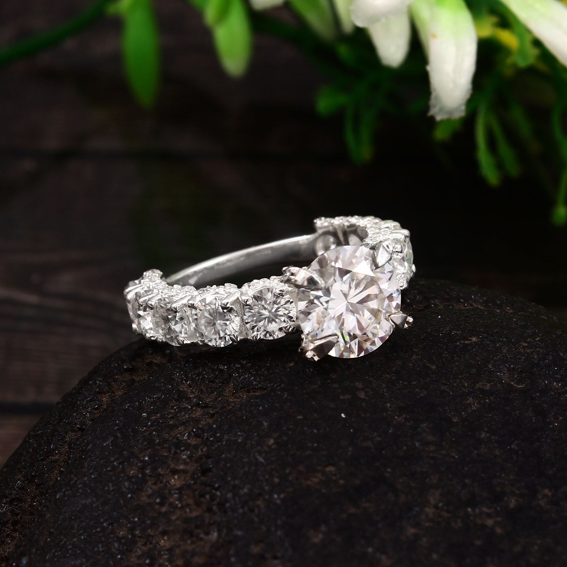 Round Moissanite Ring, Prong Setting Gold Ring, Moissanite Handmade Jewelry, Simulated Diamond Solitaire Ring, Anniversary Gift For Love Product Details : Material ::- 10K, 14K, 18K Solid Gold ✥ 𝐌𝐚𝐢𝐧 𝐒𝐭𝐨𝐧𝐞 𝐃𝐞𝐭𝐚𝐢𝐥𝐬 ↣ Shape: Round ↣ Type: Moissanite ↣ Weight: 2.15 Ct (App.) ↣ Pieces : 1 Stone ↣ Dimension: 8.50 MM ↣ Color: Colorless ↣ Clarity: VVS ↣ Making Process: Handmade - Crafted by our experienced team ✥ 𝐒𝐢𝐝𝐞 𝐒𝐭𝐨𝐧𝐞 𝐃𝐞𝐭𝐚𝐢𝐥𝐬 ↣ Shape: Round ↣ Type: Moissanite ↣ Weight: 0.7 Ct (App.) ↣ Dimension: 4 MM ↣ Pieces : 10 Stones ↣ Color: Colorless ↣ Clarity: VVS ↣ Making Process: Handmade - Crafted by our experienced team ✥ 𝐒𝐢𝐝𝐞 𝐒𝐭𝐨𝐧𝐞 𝐃𝐞𝐭𝐚𝐢𝐥𝐬 ↣ Shape: Round ↣ Type: Moissanite ↣ Dimension: 1.2 MM / 1.0 MM ↣ Pieces : 104 Stones ↣ Color: Colorless ↣ Clarity: VVS ↣ Making Process: Handmade - Crafted by our experienced team Customization:- We are able to make changes to this design according to your need or can make any other design you may desire, just send us photo of your favourite product and get it made in your desired materials. Care Instructions:- Wipe your jewelry with a soft cloth after every use Always store your jewelry in a flat box to avoid accidental scratches ✥✥✥✥✥✥Benefits Of Wearing Moissanite Gemstone✥✥✥✥✥✥ Moissanite a diamond alternative encourages you to set greater goals and accomplish success and recognition in your industry of choice. Your personality becomes more endearing, likeable, and magnificent. Also Moissanite is diamond tester positive. Moissanite is believed to be a stone of the future and can help those who want to manifest their dreams and desires. It is said to enhance intuition and creativity and can help you tap into your inner power and potential. If you have any questions or need more information, Please feel free to contact us. For more amazing designs visit our shop https://www.etsy.com/shop/Gemethysts