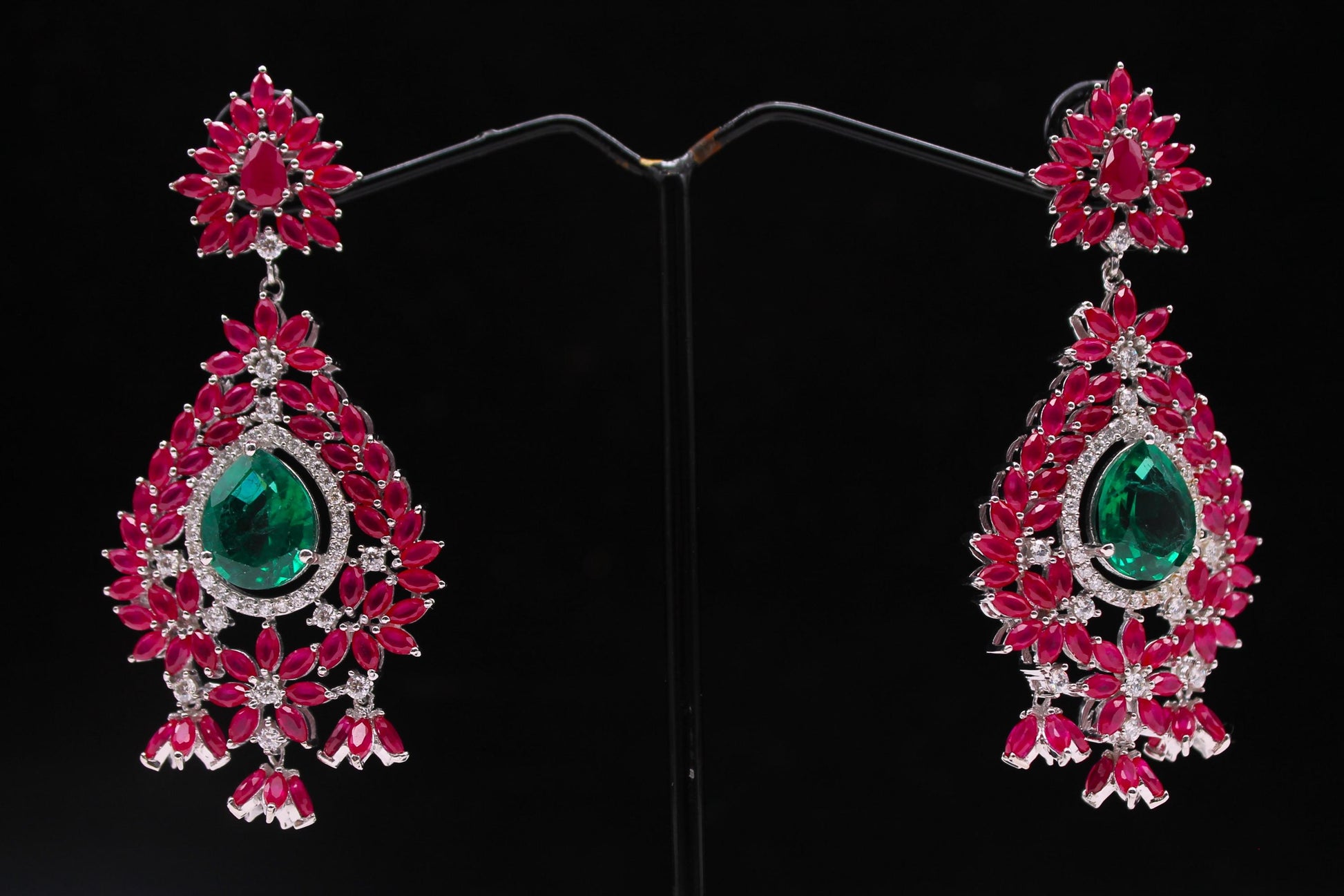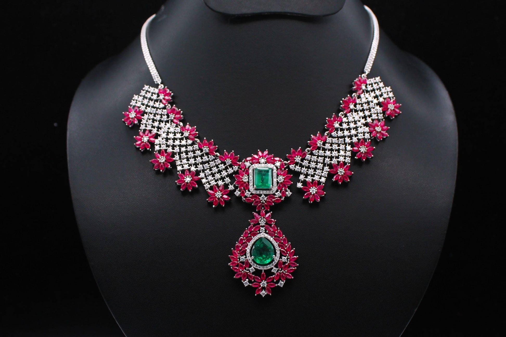 Ruby, Emerald with Moissanite Necklace, Party Wear 925 Sterling Silver Jewelry Set, Anniversary Gift For Wife, Beautiful Wedding Necklace Product Details: ↦ Metal Purity : 925 Sterling Silver ↦ Stamp: Yes ✤ Earrings 𝐃𝐞𝐭𝐚𝐢𝐥𝐬 : ↦ Hydro Emerald Pear : 12 X 10 MM - 2 Pcs. ↦ Lab Created Ruby Marquise : 4 X 2 MM - 156 Pcs. ↦ Lab Created Ruby Pear : 6 X 4 MM - 2 Pcs. ↦ Moissanite Round : 2 MM - 22 pcs. ↦ TCW : 33.40 ct. (approx) ↦ GW : 23.17 (approx) ↦ NW : 16.49 (approx) ✤𝐍𝐞𝐜𝐤𝐥𝐚𝐜𝐞 𝐃𝐞𝐭𝐚𝐢𝐥𝐬 ↦ Hydro Emerald Octagon : 10 X 8 MM - 1 pcs. ↦ Hydro Emerald Pear : 12 X 10 MM - 1 pcs. ↦ Lab Created Ruby Marquise : 4 X 2 - 210 pcs. ↦ Moissanite Round : 2 MM - 228 pcs. ↦ Moissanite Round : 1.30 MM - 60 pcs. ↦ TCW : 45.40 ct. (approx) ↦ GW : 43.86 (approx) ↦ NW : 3.78 (approx) Customization:- We are able to make changes to this design according to your need or can make any other design you may desire, just send us photo of your favourite product and get it made in your desired materials. Care Instructions:- Wipe your jewelry with a soft cloth after every use Always store your jewelry in a flat box to avoid accidental scratches ✥✥✥✥✥✥Benefits Of Wearing Moissanite Gemstone✥✥✥✥✥✥ Moissanite a diamond alternative encourages you to set greater goals and accomplish success and recognition in your industry of choice. Your personality becomes more endearing, likeable, and magnificent. Also Moissanite is diamond tester positive. Moissanite is believed to be a stone of the future and can help those who want to manifest their dreams and desires. It is said to enhance intuition and creativity and can help you tap into your inner power and potential. If you have any questions or need more information, Please feel free to contact us. For more amazing designs visit our shop https://www.etsy.com/shop/Gemethysts