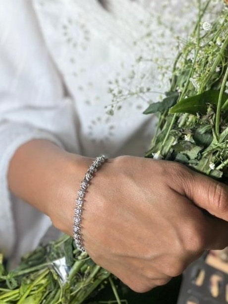 Star Bracelet With Round Moissanite, Dainty Minimalist Bracelet, 925 Sterling Silver Moissanite Bracelet, Designer Bracelet Gift for Bride Product Details :- Material : 925 Sterling Silver Total Moissanite Stones : 30 Stone : Moissanite Size : 2 MM (Customization Available In Stone) Shape : Star Customization:- We are able to make changes to this design according to your need or can make any other design you may desire, just send us photo of your favorite product and get it made in your desired materials. Care Instructions:- Wipe your jewelry with a soft cloth after every use Always store your jewelry in a flat box to avoid accidental scratches ✥✥✥✥✥✥Benefits Of Wearing Moissanite Gemstone✥✥✥✥✥✥ Moissanite a diamond alternative encourages you to set greater goals and accomplish success and recognition in your industry of choice. Your personality becomes more endearing, likeable, and magnificent. Also Moissanite is diamond tester positive. Moissanite is believed to be a stone of the future and can help those who want to manifest their dreams and desires. It is said to enhance intuition and creativity and can help you tap into your inner power and potential. If you have any questions or need more information, Please feel free to contact us. For more amazing designs visit our shop https://www.etsy.com/shop/Gemethysts